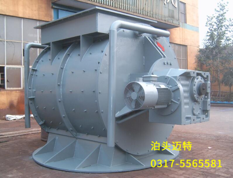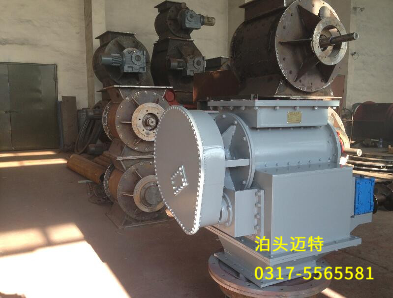 此卸料器都備有熱風通道,當入料濕度大時,葉輪底可能粘有一定厚度的粉狀物料,這時就應該通此溫度較高的氣體,使其底部的物料干燥,不易粘接在葉輪底部,不會影響給料量,不用時把進出風口盲死。